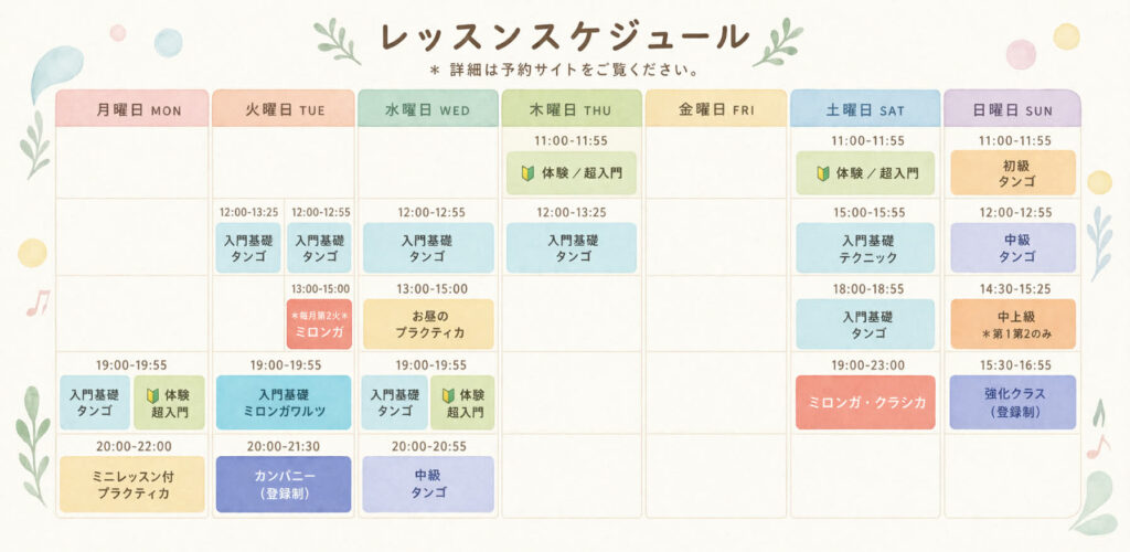 テレビで見たことあるような情熱で激しいダンスと思いきや、アルゼンチンタンゴはどこか懐かしいタンゴ音楽とともにゆったりと身体を動かし、歩くようにステップをふむペアダンスです。 「踊ってみたかった!」そんな方はもちろん、「ペアダンスなんて踊ったことない」方も、ぜひ一度ご見学にお越しください。